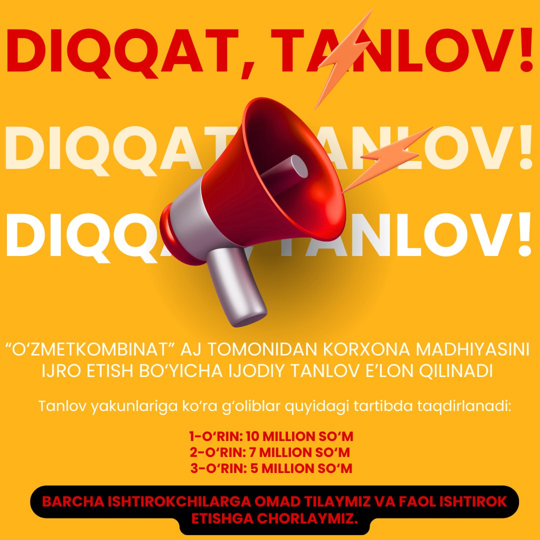 “O‘zmetkombinat” AJ tomonidan korxona madhiyasini ijro etish bo‘yicha ijodiy tanlov e’lon qilinadi.