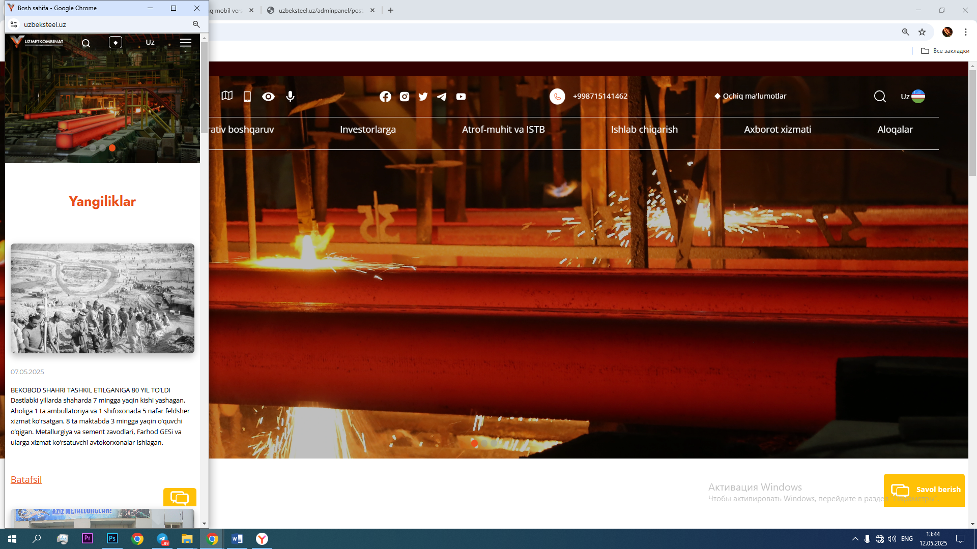"O'zmetkombinat" AJ rasmiy veb-saytning mobil versiyasi mavjud va u asosiy oynada joylashgan