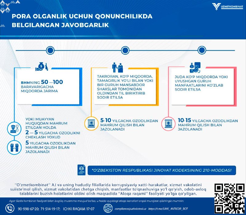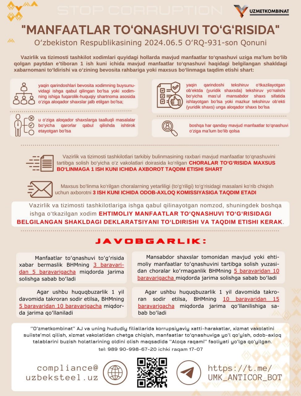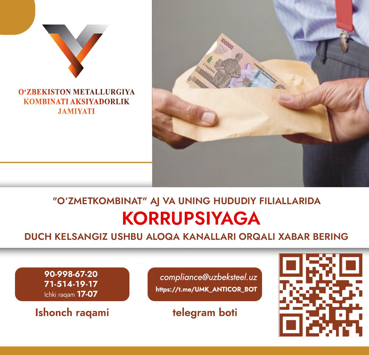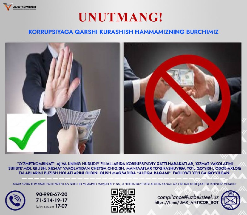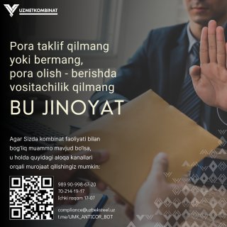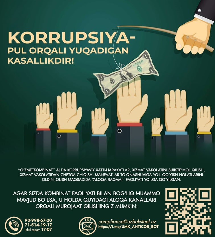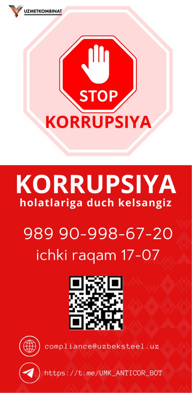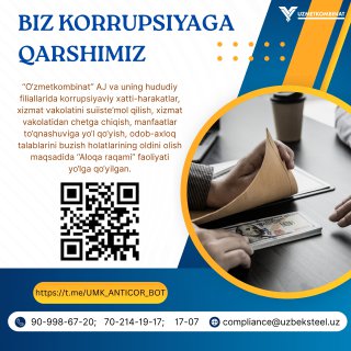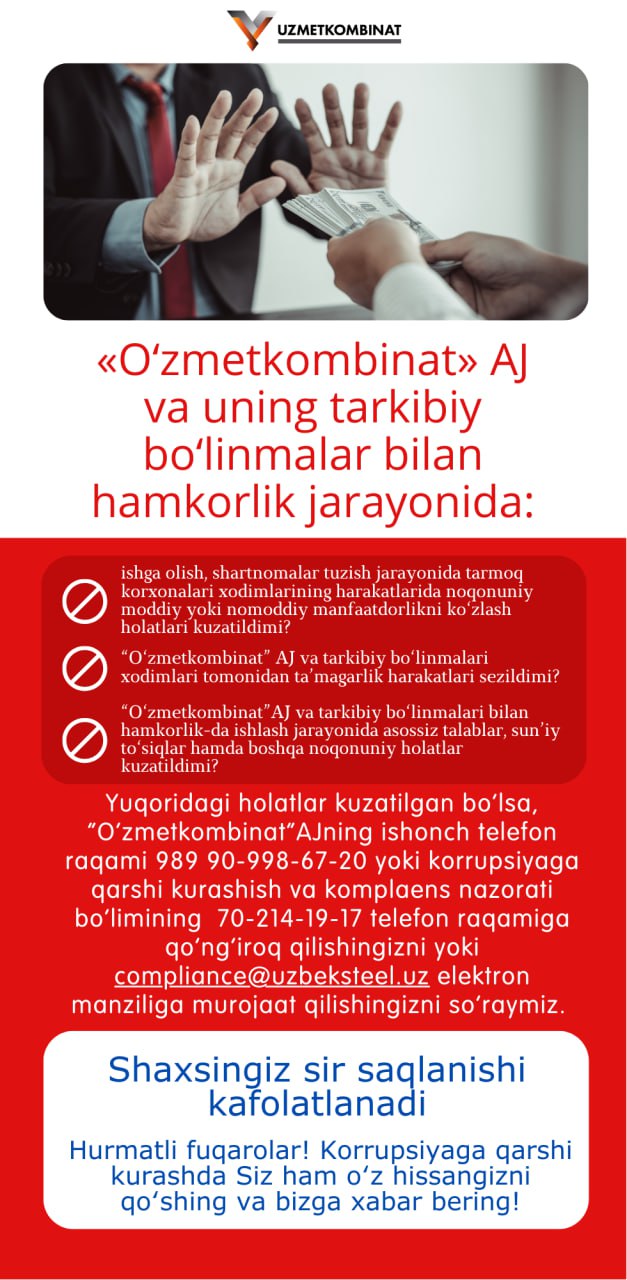 Boshqaruv raisi - Bosh direktor murojaati - "Korrupsiyaga yo'l qo'ymaylik!" ("Metallurg minbari" gazetasining 9-soni. 2025-yil avgust).