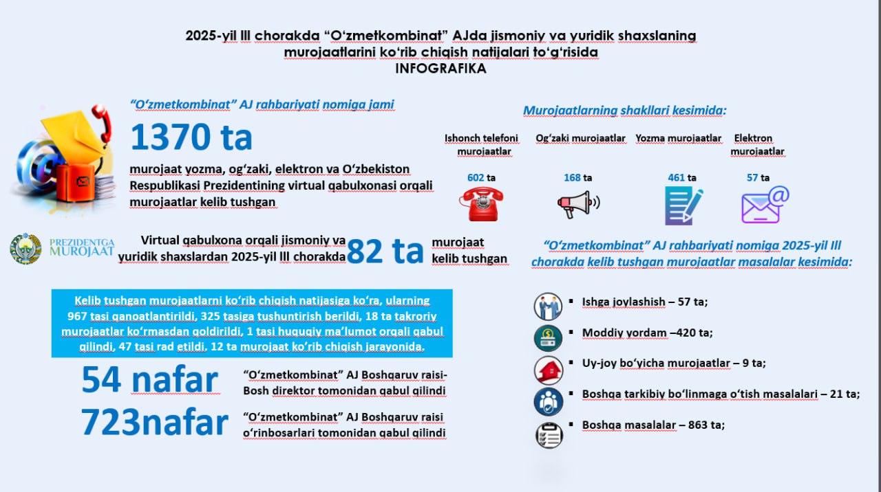 “O‘zmetkombinat” AJga 2024-yilda jismoniy va yuridik shaxslardan kelib tushgan va