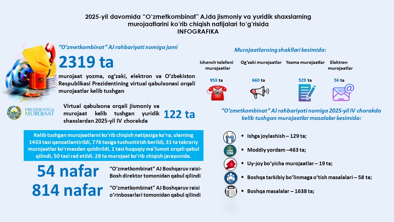 "O‘zmetkombinat" AJga 2025-yil yanvar-iyun oylari davomida kelib tushgan murojaatlar to‘g‘risida